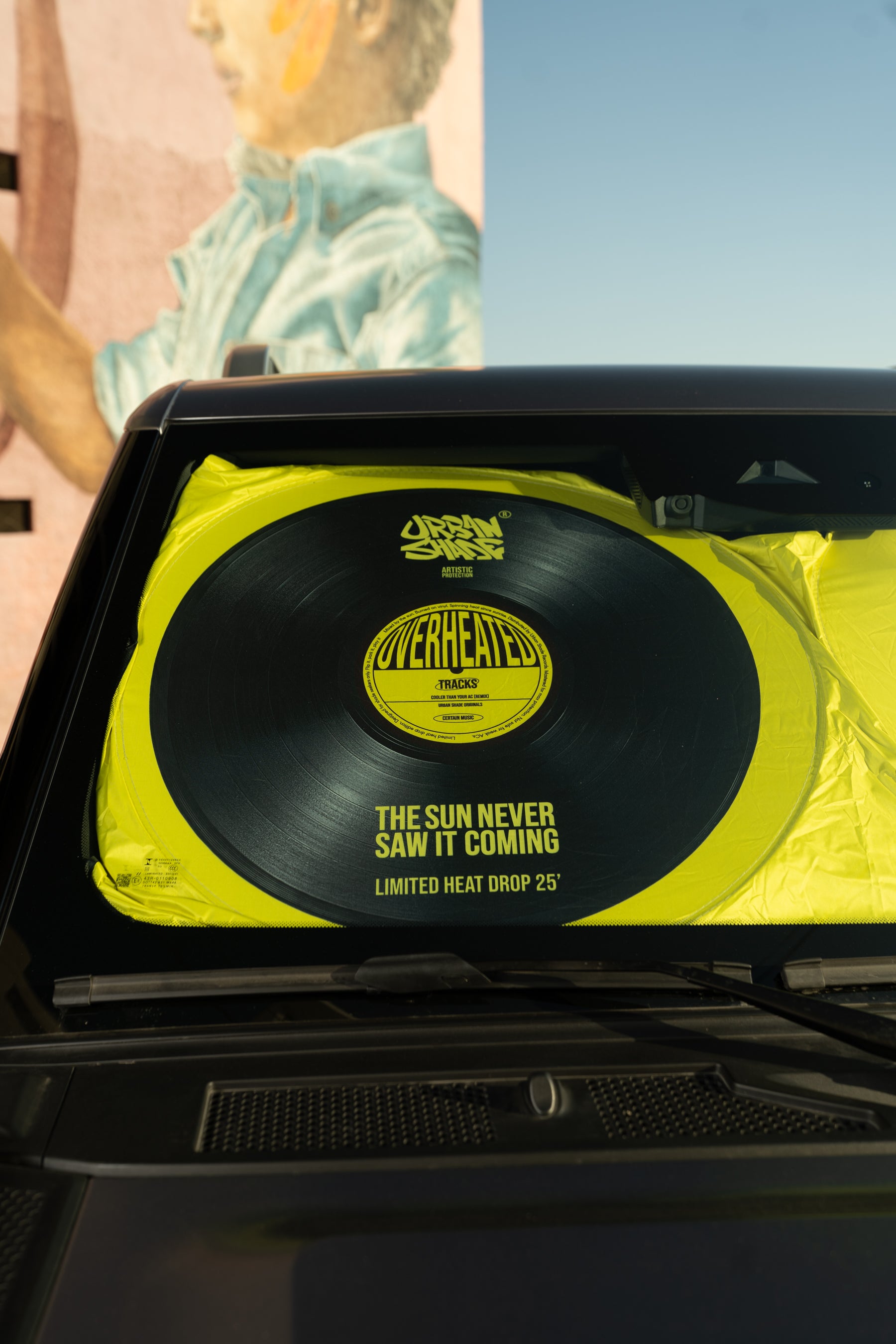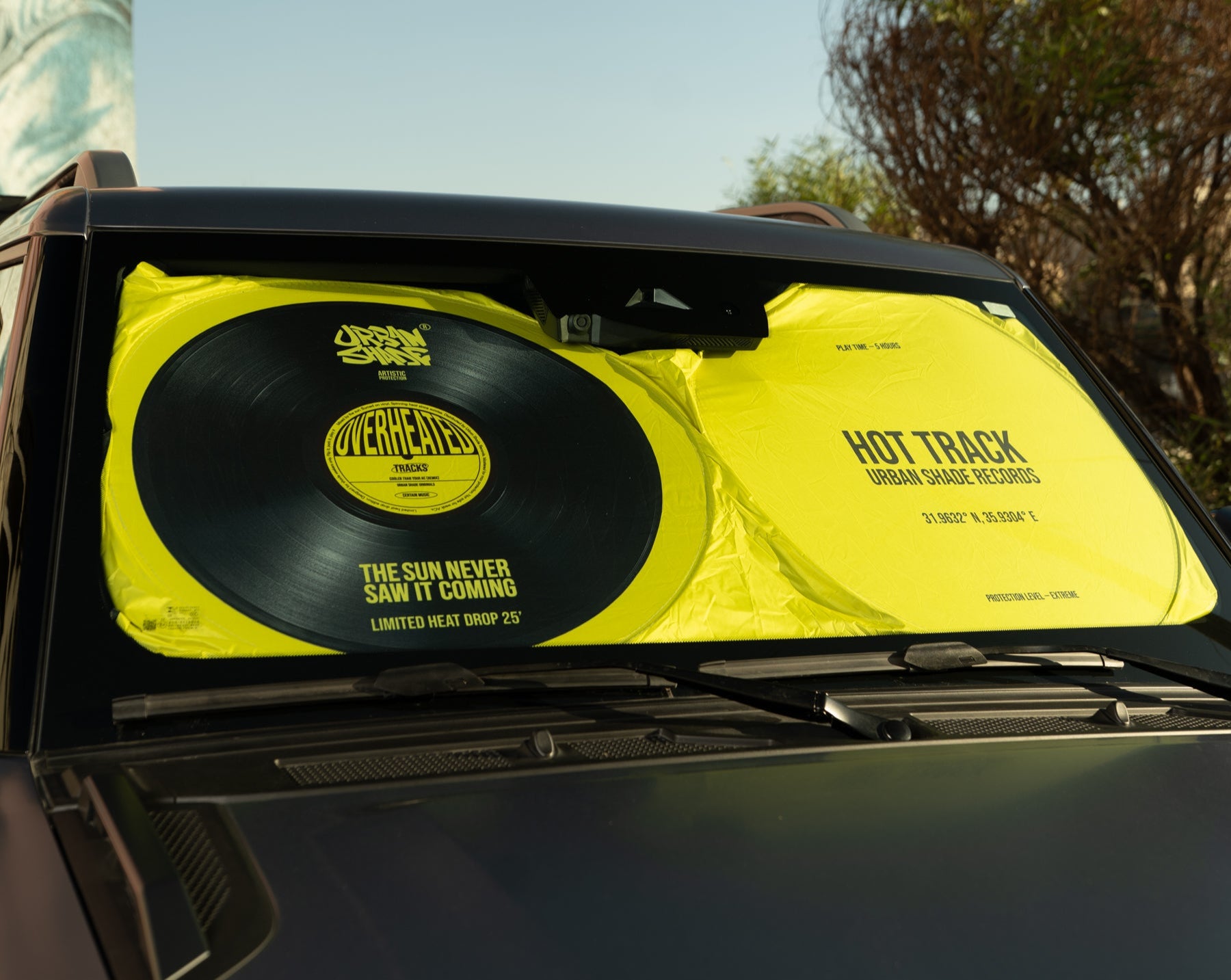Beat The Heat sunshade is a vinyl-inspired masterpiece straight from Urban Shade Records. Featuring our exclusive “OVER HEATED” print, this design fuses nostalgia with bold street-art energy. From the grooves to the gritty label details, it's more than a sunshade it’s a heat-defying album cover for your ride.