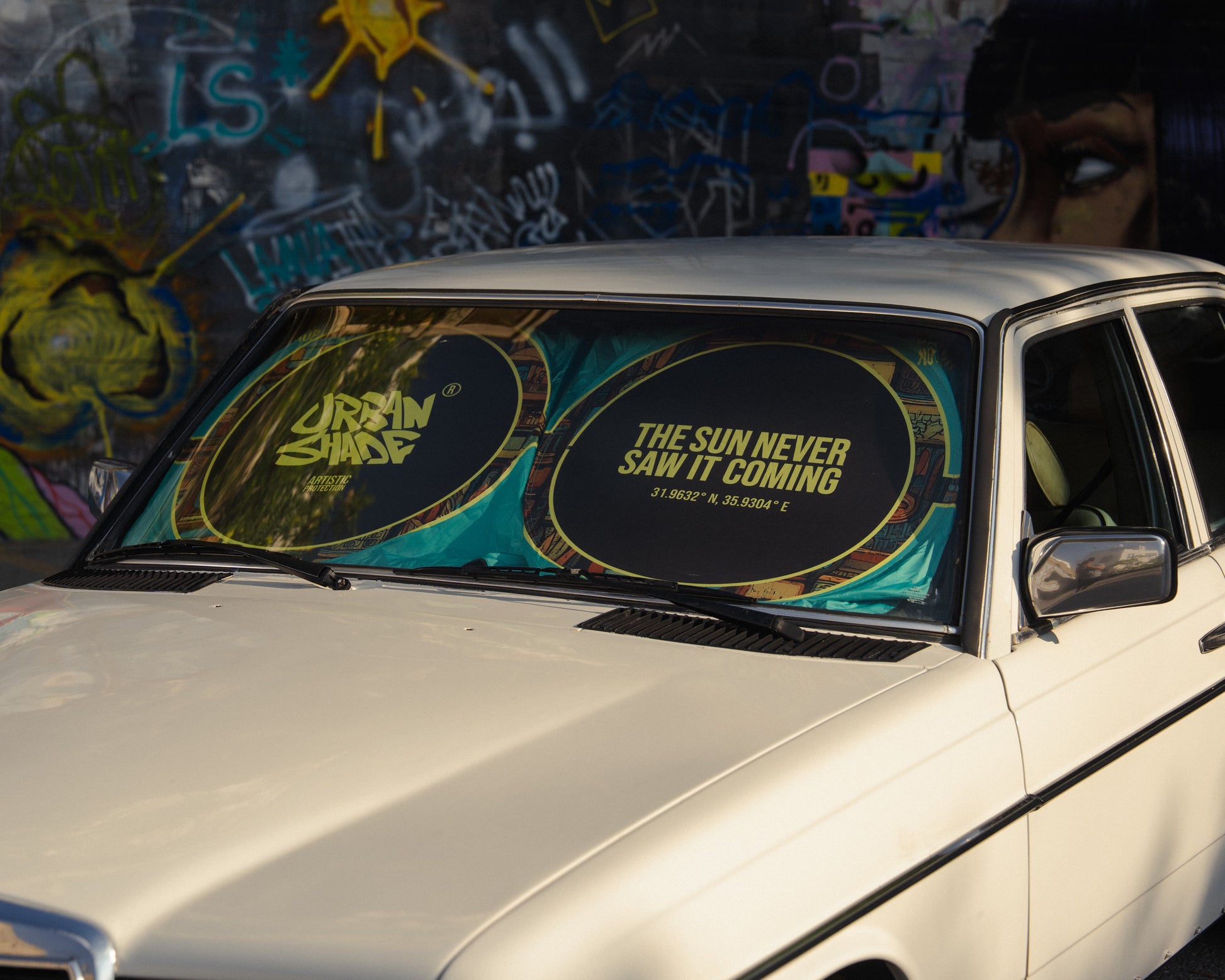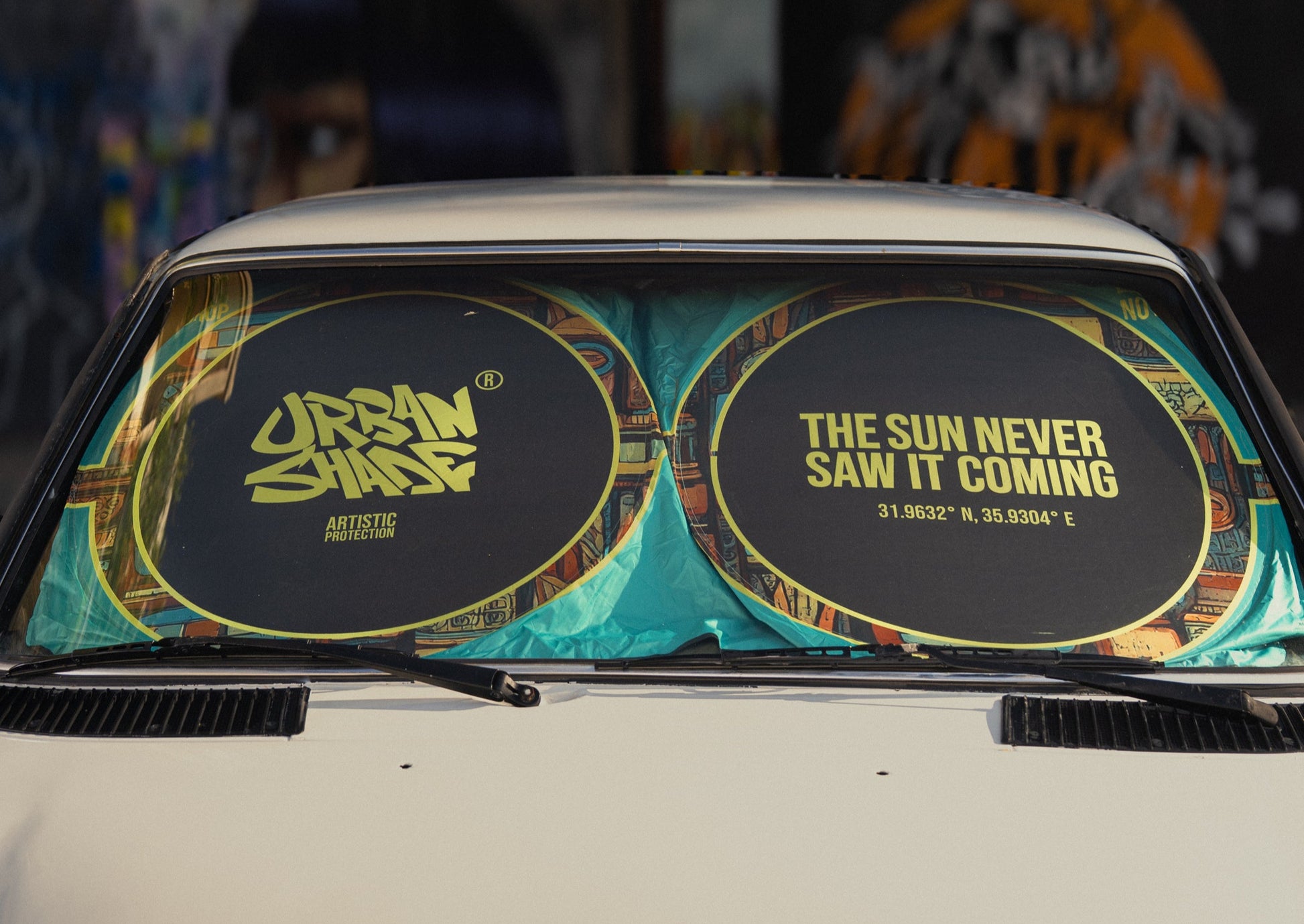 Sun out? Shades on. This design turns your windshield into a pair of oversized sunglasses, blocking heat with attitude and a hint of fun. The bold lenses and vibrant temple pattern keep things playful while delivering full protection from UV and glare.