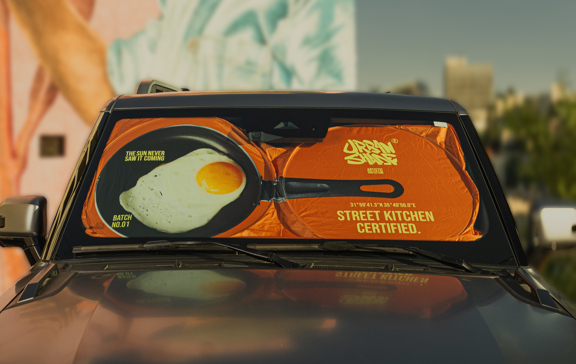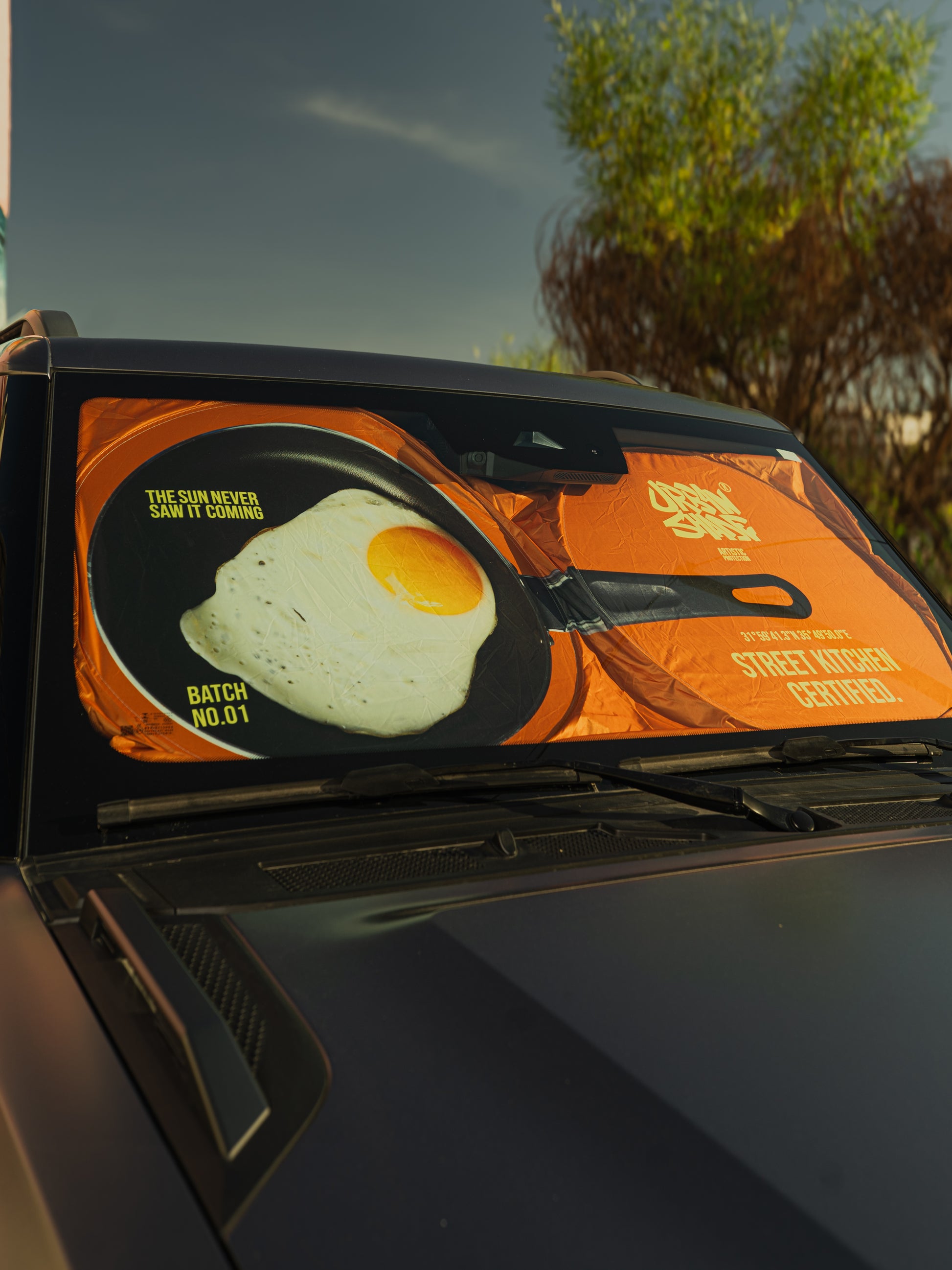 Your car shouldn’t feel like a frying pan. Solar Scramble flips the heat joke on its head with a design that says it all — no words needed. Bright, bold, and a little sunny-side-up, this shade keeps things cool while serving a reminder of what happens when you park without protection.